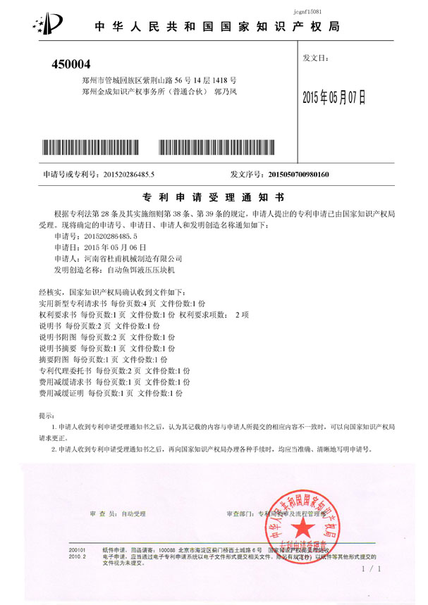 | A:自動(dòng)魚(yú)餌液壓壓塊機(jī)專(zhuān)利受理通知書(shū) |